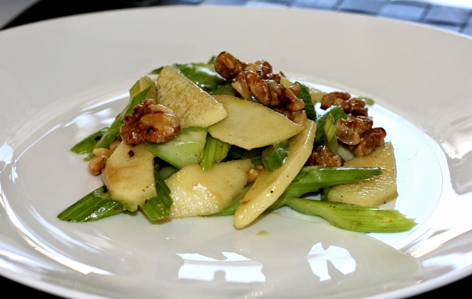 - Slice the apples and celery on diagonal; chop some of the celery leaves also, mix in a bowl together with the toasted walnuts. Add vinaigrette and season with salt and pepper.